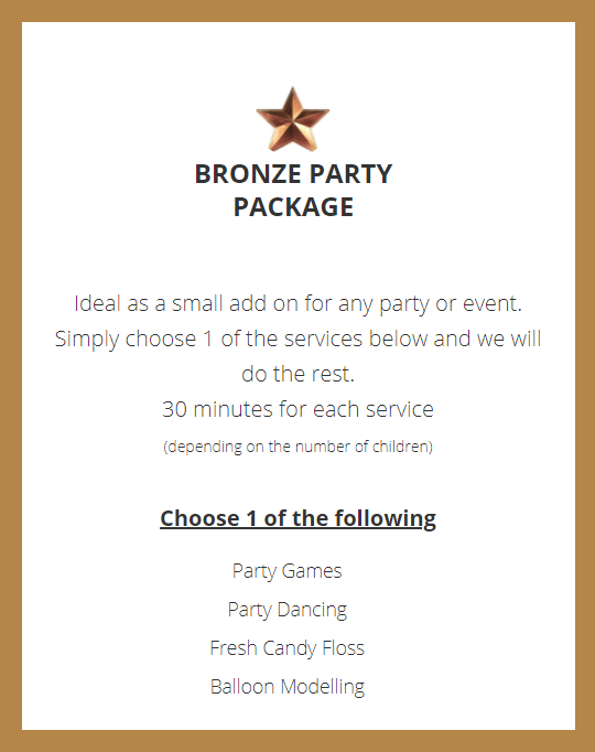 Our children's services are not only perfect for parties but also ideal for family fun days, school fairs or any event aimed at children. Choose one of our Party Packages or pick & choose to create your own package.